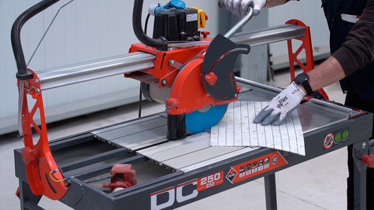 3-On a work table with a slot, we cut the Ezarri mosaic of whatever format: 25, 36 or 50mm An important detail, which can be seen in the video, is that the mosaic must be ground from the side and not from above.