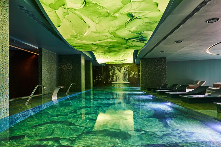 This means that 1,350 square metres of Ezarri´s special combinations and designs were put into play. In addition, more than 360 m² of Custom Printed Mosaic completely cover the indoor wellness pool and waterfall. For the final bespoke touch, the hotel´s rooftop pools were decorated with Custom Printed Mosaics: a moon for the Skypool and a huge jacaranda tree for the VIP Lounge Pool.
