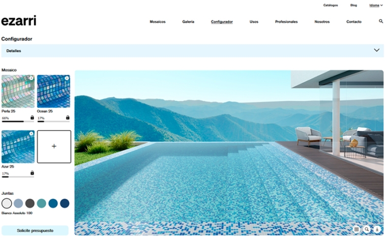 Pero esto no es todo. Tú tienes el control con ezarri: podrás personalizar al máximo el revestimiento de tu piscina, con nuestro configurador. Experimenta con tonos vibrantes, sutiles o atrevidos, y crea un espacio que sea un reflejo fiel de tu personalidad.