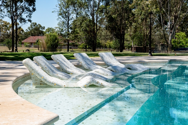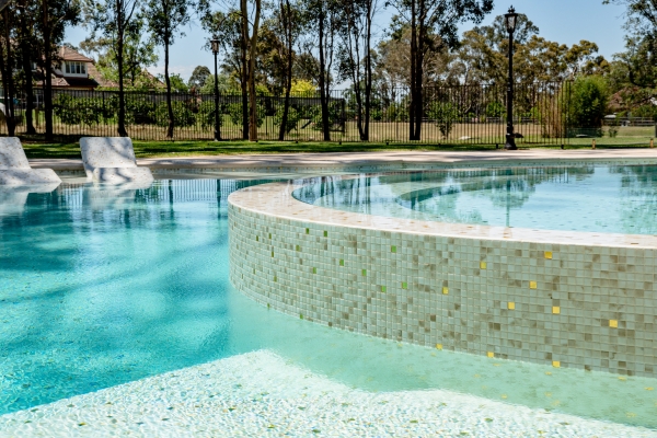 El corazón visual de esta obra reside en la elección de la referencia Sponge Gold, perteneciente a la colección Gold lanzada en 2023, que eleva el concepto de gresite para piscinas a un nuevo nivel artístico. Este mosaico integra teselas de vidrio con incrustaciones de oro de 24 quilates, lo que, sumado a un acabado mate y una textura con efecto acuarela, genera un impacto visual sin precedentes. Bajo la intensa luz natural de Australia, el revestimiento interactúa con el entorno para transformar el agua en un tono azul cielo claro, aportando una luminosidad y amplitud excepcionales a todo el espacio.