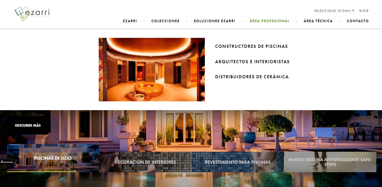 Jarraian, «Ezarriren irtenbideak» atala dugu; eta, horren barruan, «Igerileku pribatuak», «Contract proiektuak», «Barne-dekorazioa» eta «Wellness» erlaitzak. Atal horretan dago Ezarriren giharra; proiektuak, erantzun azkarra eta eraginkorra ematen baitiegu, nola gauzatzen diren azaltzen da.