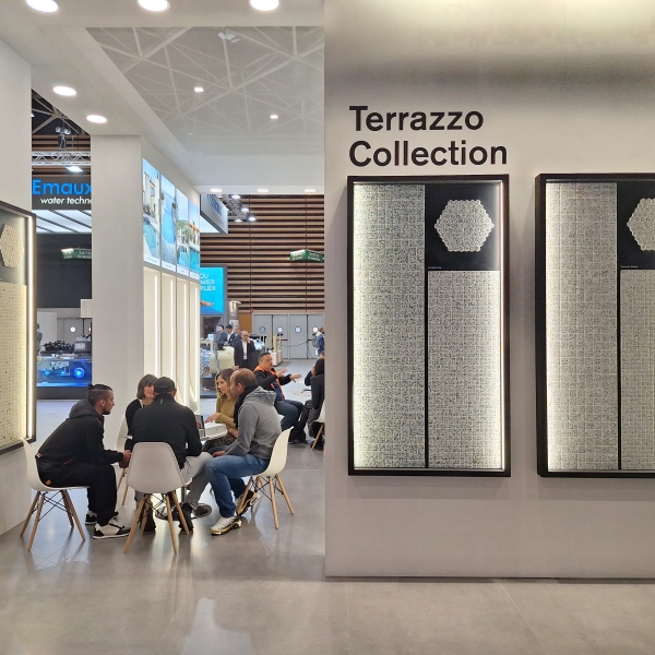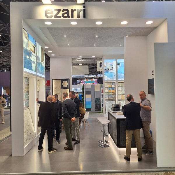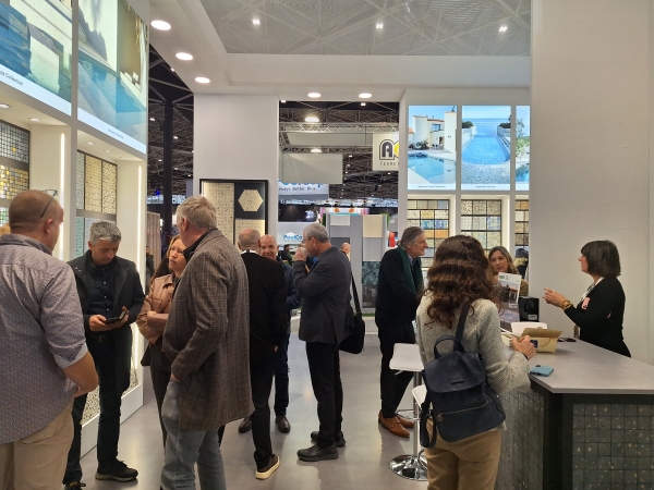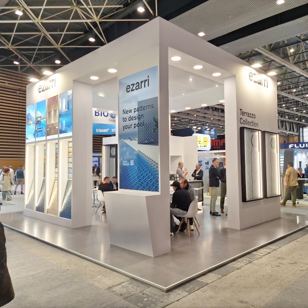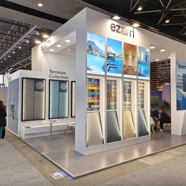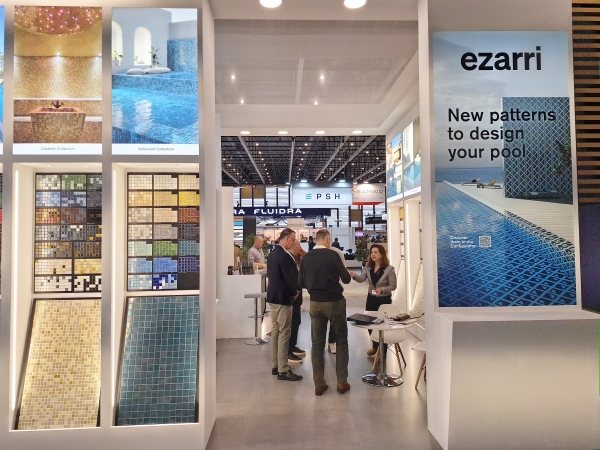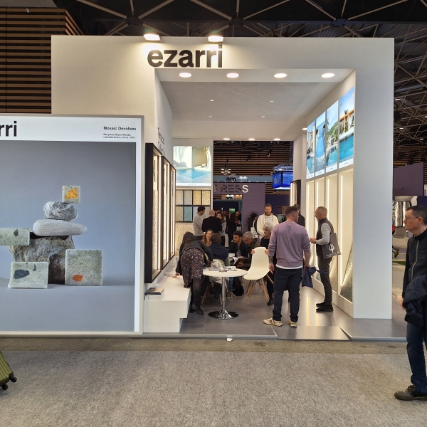 Sur notre stand, nous avons présenté nos dernières collections, où innovation et durabilité vont de pair. La mosaïque de verre 100% recyclé d´Ezarri continue de révolutionner le secteur de la piscine et du bien-être !