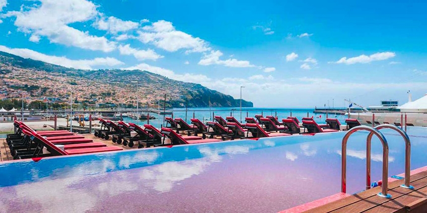 Ezarri a utilisé pour les revêtements de ce complexe de luxe et style sa variété déjà reconnue de couleurs, ici dans les tons rouge, qui contraste avec le bleu océanique et qui revendique clairement les couleurs du maillot officiel de la sélection nationale portugaise, le rouge.